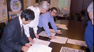 Figure 1: Judges assess more than 600 typeface designs from 30 countries at the bukva:raz! competition in Moscow. Gerry Leonidas makes a point about one of the submissions. (Left-to-right: Akira Kobayashi, Matthew Carter, Gerry Leonidas, Fiona Ross, and Yuri Gherchuk.)