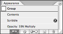 When you apply appearance attributes, the object or layer’s target circle in the Layers palette becomes shaded. This makes it easy to identify layers where attributes like Opacity and Blending Mode have changed; just click an object’s target indicator in the Layers palette (Figure 11), and then look at the Appearance palette to see the object’s appearance settings (Figure 12).