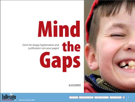 You’ve surely seen a page of justified text with big gaps between words. Instead of reading across, your eyes drift downward, following the cascading sequence of gaps. It’s the dreaded phenomenon known as “rivers of white space.” Then you glance across the page and your eyes flit between several dark patches where words are uncomfortably crunched together. Maybe you don’t have these problems because you set your body copy flush-left. Yet you still may be plagued with short lines sprinkled throughout, or gutters that look twice what they’re spec’ed. Achieving an overall consistent spacing in your body copy is important — without it, readers will be distracted by uneven light and dark patterns, and you’re likely to lose your audience. In this article, you’ll learn how to fix these problems. Be sure to go to the last page of the PDF for a special discount on an InDesign Magazine subscription. To read the article as a PDF file in your Web browser, click “Mind the Gaps.” You can also download the PDF to your machine for later viewing. To open the PDF, you’ll need Adobe Acrobat or the free Adobe Reader. We highly recommend Adobe Reader 7.0 and above to view this PDF. To learn how to configure your browser for viewing PDF files, see the Adobe Reader tech support page.