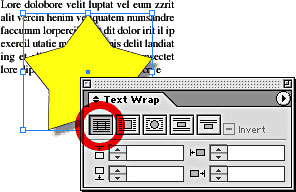 In InDesign you apply text wrap using the Text Wrap palette. Select the object you want to have text flow around, and choose Window> Text Wrap to open the palette. With no wrap applied, text flows behind the object (figure 1).