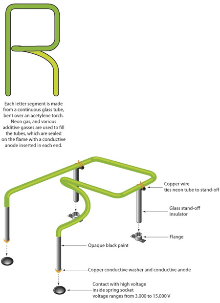 Neon lettering is tricky stuff. I designed the basic shapes but left the exact letter-shaping to the neon expert at the sign shop. Master neon workers are pretty rare, and they earn their keep. For this sign I concerned myself only with the practicality of the letter shapes. Each tube is one piece, cleverly bent over a torch to the shape of the letter. With some opaque paint and proper mounting, the tubes turn into letters when the sign is powered up.