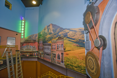 In the process of building the interior spaces, I got involved as a photo-muralist. My plan was for a large interior mural for the grand staircase that rises from the ground floor to the second floor of the new museum. The idea was to make a cityscape mural that’s reminiscent of our town, but fanciful and more colorful than the real thing (Figure 1).