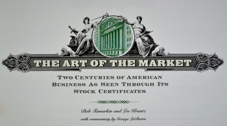 I recently came across a terrific book on eBay called The Art of the Market: Two Centuries of American Business as Seen Through Its Stock Certificates by Bob Tamarkin and Les Krantz. It’s a well-designed, well-printed beautiful coffee-table style book that does a great job reviewing the history of stock certificates, and presents many samples of these quickly disappearing remnants of publically traded companies. The book appears to be out of print, but you can still find new and used copies on Amazon and elsewhere.