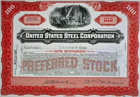 The book gave me the excuse to take a look at stock certificates, and I’ve supplemented images from the book with others I’ve collected from around the Web and elsewhere. Stock certificates have become very collectible – the field is referred to as Scripophily and those who collect them Scipophilists. In the Tamarkin and Krantz book, you’ll not only find an interesting history of the actual certificates, but an impressive review of American business throughout several centuries. Click on any image for a larger version.