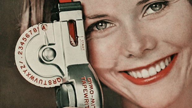 The selection of type styles was pretty limited, and the embossed white letters somewhat crude, but there was no mistaking what the label said. And they were extremely durable. Anyone who ever tried to remove an early Dymo label knows that the adhesive was industrial strength. Over time the color selection became greater and models appeared for the home, schools, and even the “executive” (sold in a fine leather travel case).