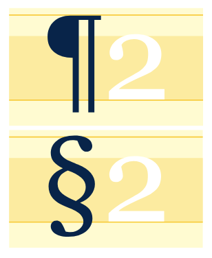 The unusual English name for the paragraph sign, “pilcrow”, may have its roots in the French “pelagraphe”, a corruption of the English “paragraph”. Its shape evolved from the capital C with double slash—”C” for capitulum, “chapter” in Latin. The pilcrow denotes paragraphs in legal and academic writing. In desktop publishing software, it marks the presence of an invisible carriage return at the end of a paragraph. This last application has caused the pilcrow to be adopted as the universal icon in desktop publishing for hidden characters, such as spaces, tab characters, end of line and page breaks, and so on. Related to the pilcrow, the section sign mainly refers to a particular section, such as legal code. The double S shape originated from the Latin “signum sectionis”. Both pilcrow and section sign can also call out footnotes, after the asterisk, dagger, and double dagger. However, this usage is declining in favor of numbered footnotes.