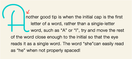 • If the initial cap is the first letter of a word, rather than a single-letter word, such as “A” or “I”, try and move the rest of the word close enough to the initial so that the eye reads it as a single word.