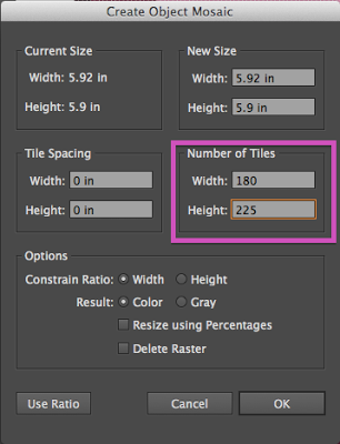 7. Select your artwork and apply Create Object Mosaic. Choose Object > Create Object Mosaic. This is where you’ll plug in the numbers you calculated in Step 4.