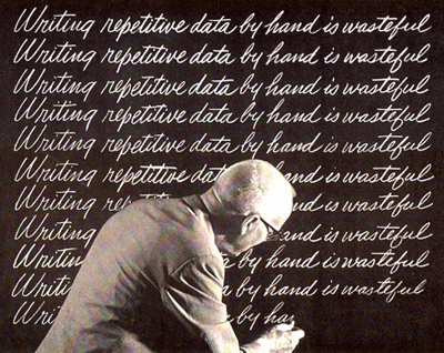 The quest for ways to make copies produced all kinds of interesting contraptions, from high-pressure copy presses that literally squeezed the ink out of a document to create a ghosted duplicate, to the polygraph, a device that Thomas Jefferson used when writing out documents. In that machine a writing pen was attached to an elaborate mechanism that controlled a second pen, which in theory duplicated the writer’s movements on a second sheet of paper. No one, it seemed, wanted to do anything twice, and the job of office copying clerk was considered a poor one-spending the day at a desk re-writing documents. Talk about repetitive stress injuries!