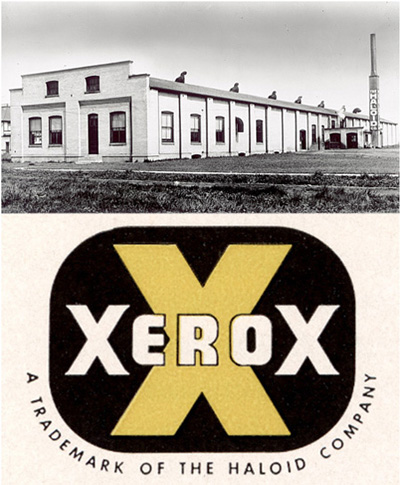 The original Haloid factory in Rochester, New York, and the first logo under the XeroX brand (which had a capital X on both ends for a long time).