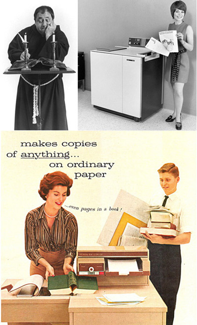 The Xerox 914 (below) as advertised in 1961. Xerox advertising later became famous for the character Brother Dominic (above) who appeared in ads throughout the Seventies.