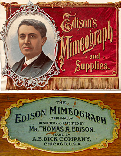 Thomas Edison’s Mimeograph Machine was licensed by the A.B. Dick Company and sold through the 1970s as a low-cost, easy way to make multiple copies of simple documents. The reproduction quality was pretty poor by today’s standards.