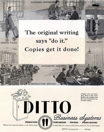Mimeograph duplicators became standard office equipment in the 1940s (when this ad from A. B. Dick appeared in Fortune Magazine), and were popular anywhere runs of 25 to several hundred copies were needed. The photo on the bottom is from Navy archives and shows someone making mimeographic copies during World War II.