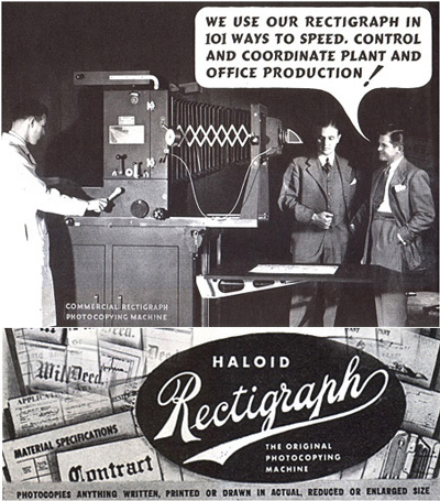 The Rectigraph (shown here in ads from 1943) was one of the more popular machines in the early half of the last century that could photograph documents to make accurate copies. The photographic process, while technically pretty good, was obviously difficult and costly-not the push-button solution to copying that we needed. The Haloid company, sellers of the Rectigraph, would soon expand from their photographic roots to become the Xerox Corporation.