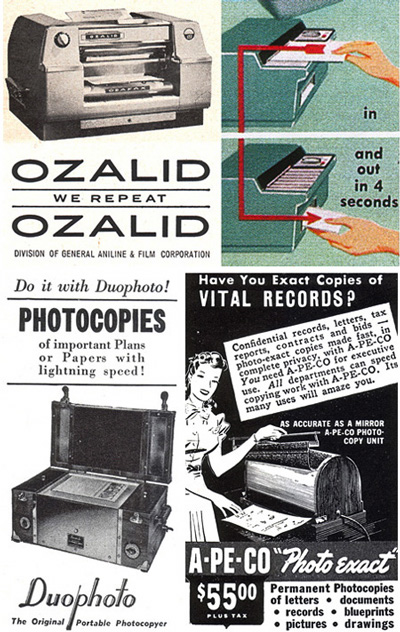 There were numerous brands of photo copiers using specially treated paper, as shown in these ads for A-Pe-Co (1943), Duophoto (1945), Ozalid (1961), and 3M (1960). All of these methods were expensive per copy, but were popular because the machines themselves were relatively cheap and small. However, for more than a copy or two, they were terribly impractical, and the copies often smelled bad and deteriorated quickly.