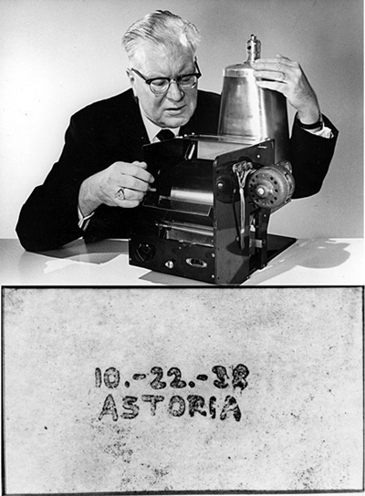 Inventor of the electrophotography copying methods later dubbed “Xerography,” Chester Carlson (above) is shown with his first apparatus. Below is the very first copy made by Carlson and his lab helper Otto Kornei in 1938, a hand-written message documenting the date and location. That original is currently in the Smithsonian Museum in Washington, D.C.