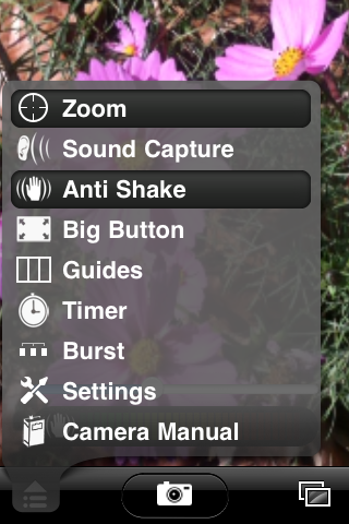 Camera Genius’ Anti-Shake feature doesn’t actually stabilize anything; instead, it uses the iPhone’s accelerometer to determine when the phone is stable. After activating the feature, you press the shutter button, and the phone won’t shoot until it is stable.