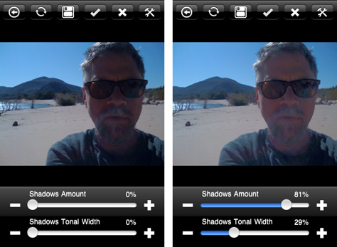 Perfect Photo’s Shadow and Highlight sliders are akin to Photoshop’s Shadows/Highlights adjustment. With these controls you can quickly brighten shadow areas or calm down highlights. While you’ll probably find that your iPhone images don’t have near the editing latitude of even the cheapest point-and-shoot digital camera, these tools can still make quick work of brightening a dark image.