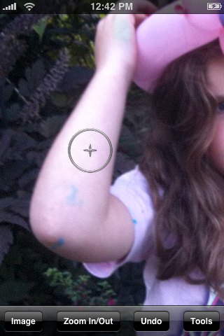 Figure 8. Here I’ve set the source point for a cloning operation in Magic Touch. Like all other current iPhone retouching tools, Magic Touch is a little hampered by the fact that your finger obscures your view of your retouching, making accurate work difficult.