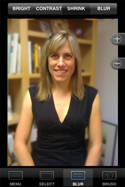 It’s hard to perform much retouching on the iPhone, both because of the small screen size and because using your finger as a brush means you can’t see where you’re painting. Nevertheless, there are clone stamp options. Nick Drabovich’s Magic Touch ($.99) is the most comprehensive, with a huge assortment of brush-on retouching effects. In addition to a normal clone stamp, you also get paintbrushes, smudge, brightness, color dodge and burn, the ability to brush on black and white conversion, and many other blending mode effects.