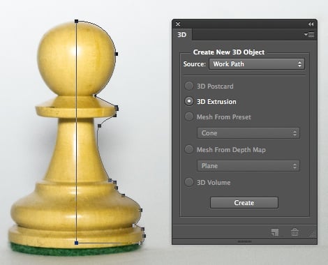 Initially, the 3D object will be created by simply extruding the pawn half, as seen here (if you’ve used the selection rather than the Pen method, you’ll see the pawn image on the face of the object). We now turn it into the right kind of object.