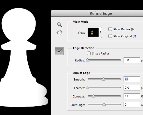 Assuming you don’t like the Pen tool, select the area outside the pawn with the Magic Wand tool, then use Select > Inverse so just the pawn itself is selected. Choose Refine Edge from the Options bar, and increase the Smooth value to iron out any wrinkles. Hit Enter to turn it into a selection.