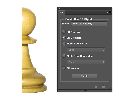 From the 3D panel, choose Selected Layer as the Source, and then 3D Extrusion as the method. Click the Create button to make your 3D object.
