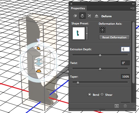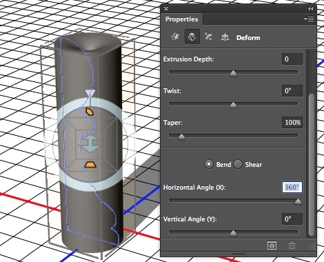 Now to lathe that pawn. Towards the bottom of the Properties panel you’ll find the Bend and Shear controls. Make sure the Bend radio button is checked, and type in a value of 360° to make a full revolution.