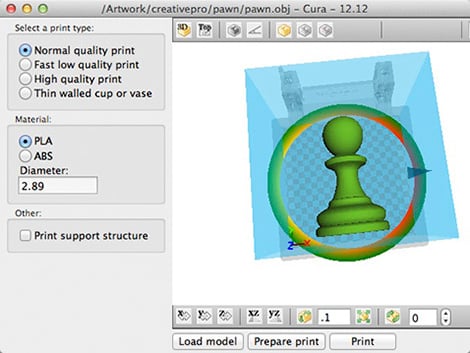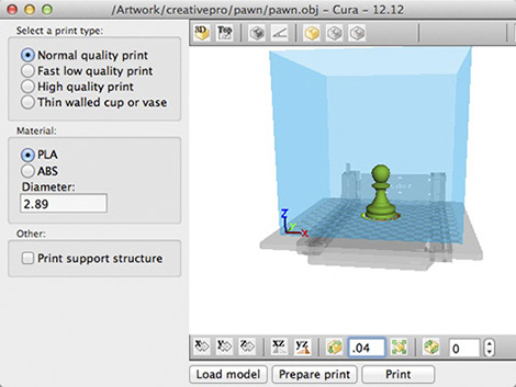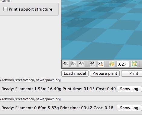 I’ve guessed a fraction that’s 0.04 of the original size here, gauged visually so the pawn looks more or less right. After choosing the settings for a normal quality print, clicking Prepare Print begins the process.