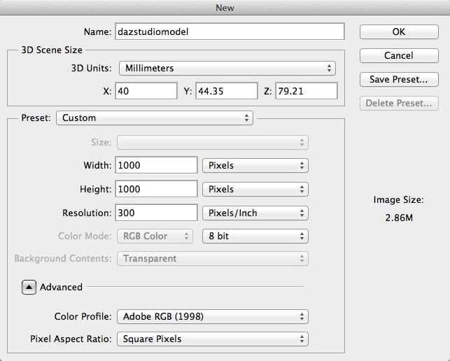 There’s also a lot of innovation in Photoshop’s 3D printing process. Photoshop can open a variety of 3D model formats directly (including OBJ, the most common format) and, when doing so, asks at what size you want to import it, in either inches or millimeters: