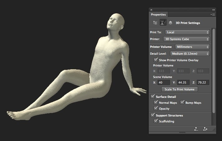 A new pane in the Properties panel displays the 3D print settings, where you can choose the print volume, the level of detail, and whether to include support structures: