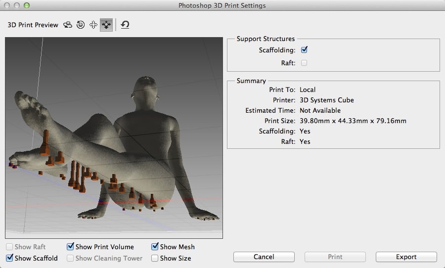 The next stage is to choose 3D Print from the 3D menu. This is where the heavy lifting gets done: Photoshop analyzes the model, repairs meshes and patches holes to make everything watertight, and adds the scaffolding support.