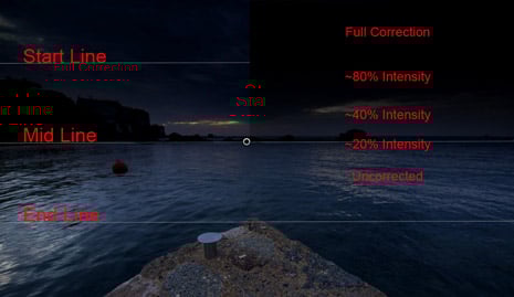 * The midpoint of the gradient, indicated with a black and gray circle in the center, marks the area where the gradient fades from corrected to unaffected.