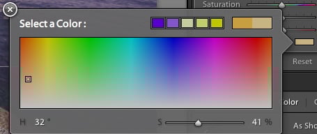 One of my favorite features in the Graduated Filter tool drawer is the color box, which adds a tint to the gradient to warm it up or cool it down. Click on the small box to the right of the Color heading to open the color picker and select a color to use as a tint (Figure 8). I prefer to select a heavily saturated color toward the top of the color picker, then use the saturation slider at the bottom of the color picker to decrease the intensity of the tint being added to the photo. Click on the “X” in the top left of the color picker to close it.