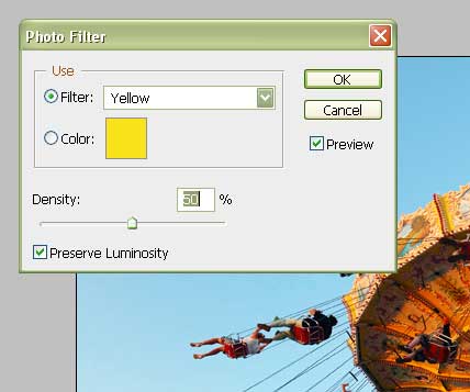 Now click the Background layer in the Layers palette to select it. Go to Layer > New Adjustment Layer > Photo Filter. Click OK to use the default name Photo Filter 1. Change the Filter to Yellow and the Density to 50% (Figure 18).