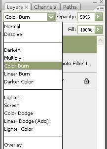 Click the top layer, Layer 1, to select it in the Layers palette. Change the layer blending mode to Color Burn and the opacity to 50% (Figure 19).