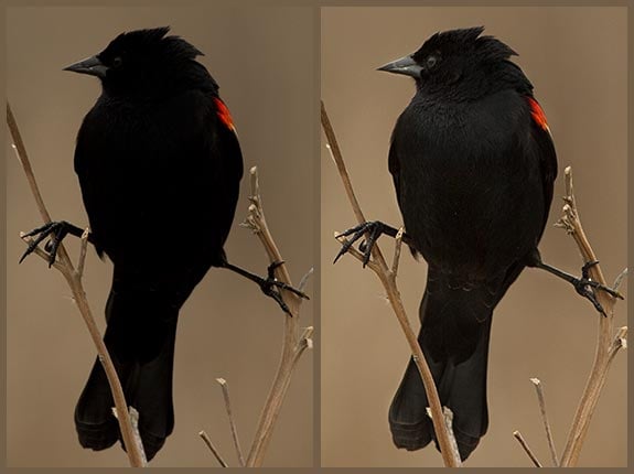 When the color of the main subject is the darkest of darks, and the shooting situation does not lend itself to using supplementary lighting, fill cards, or multiple exposures to apply the HDR (high dynamic range) technique—as in the case of this photograph of a red-winged blackbird—the detail can be brought out in post-processing.