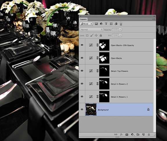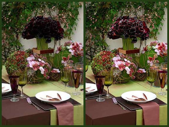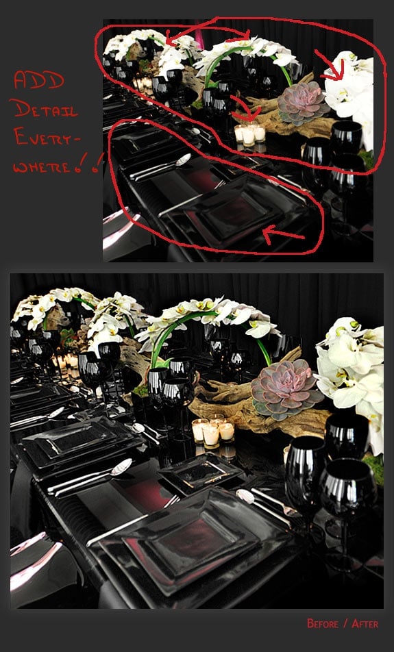 Before/After: The third example illustrates a photographic nightmare in terms of dynamic range—black plates on a black table with black linen, juxtaposed next to white orchids.