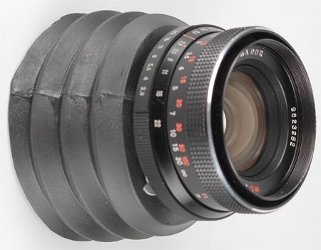 Oversized lens. I used an old Carl Zeiss made for the now-obsolete Pentacon 6 camera format. Millions of these were manufactured, and eBay is full of good deals on them.