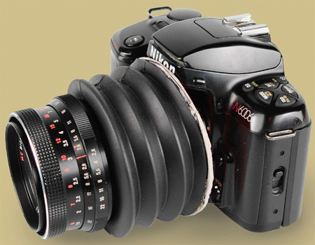 Then I hot-glued the parts together, body cap into ring, and ring, black side in, onto bellows (Figure 7). The hot glue is for expediency; if, after some experimenting, you think you’ll use this lens setup often, I recommend finding something sturdier than hot glue and cardboard to hold it together.