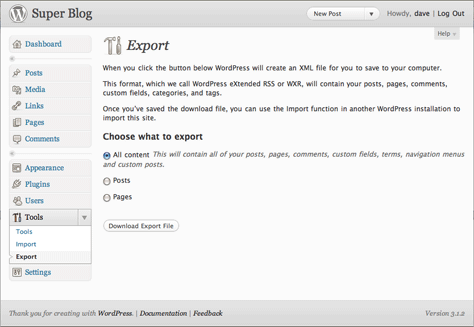 Figure 1. Back up all your WordPress content with the Export tool. Click the image below to see a larger version.