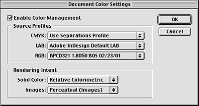 Figure 2: InDesign’s Document Color Settings dialog gives you the control you need to implement solid color management.