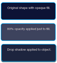 In my example above, if you wanted to create an object that had a transparent fill and a drop shadow, you’d first apply a drop shadow layer effect. But you wouldn’t want to reduce the Layer Opacity, because that would lower the opacity of the drop shadow along with the art itself. Instead, you’d adjust the Fill Opacity, which will allow the just the art to be transparent, leaving the drop shadow at full strength.