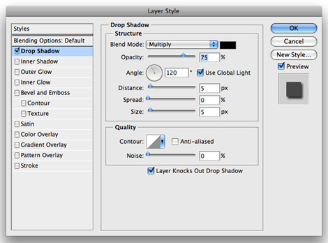 But notice that the drop shadow isn’t visible through the art of the object itself. It’s as if the artwork knocks out the drop shadow beneath it. How did that happen? The answer lies within the Drop Shadow section of the Layer Styles dialog box. There you’ll find a checkbox marked “Layer Knocks Out Drop Shadow”, which is turned on by default.