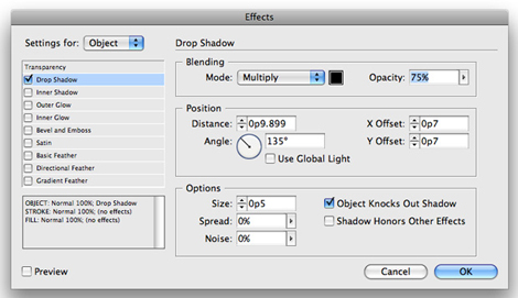 One final note: the Object Knocks Out Shadow found in InDesign will only work when your entire object has an opacity setting applied to it. However, if you try to simulate this exact effect in InDesign, where you apply an opacity value just to the fill of an object, you’ll have to use the same technique as we used in Illustrator — you’ll have to turn on the Knockout Group option for that object.