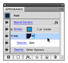 3. Choose Window > Appearance to open the Appearance panel (and shame on you if the panel wasn’t already open). Target the dark blue fill and change its opacity to 80%.