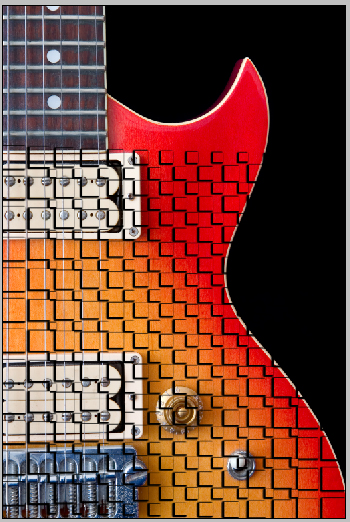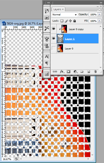Now you’ll add the clipping mask. Click and drag the layer with the squares in it below the Layer 0 Copy layer, so it’s second from the top in the Layers palette. Hold Option (PC: Alt) and hover the mouse in between the square layer (Layer 1) and the duplicated photo layer (Layer 0 Copy) and click. Click the Eye next to Layer 0 to see the effect so far.