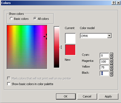 You can also create a specific color formula. Publisher has icons for line, text, and fill color. By selecting any of these icons, you can select the feature More Colors and choose the tab Custom. Enter your specific color build here and it will become a square of color in your palette.