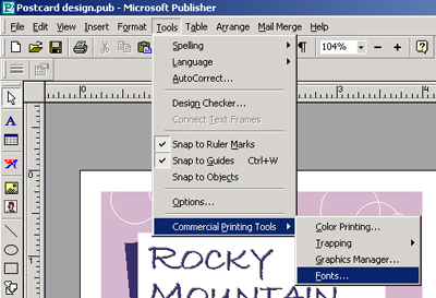 To see a list of the fonts used in your layout, select the Fonts menu option under Commercial Printing Tools.