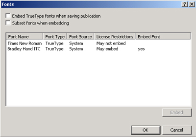 To find out which fonts are in your completed project, go to Tools > Commercial Printing Tools > Fonts. Send copies of the fonts to the printer along with the layout file. Your printer will have all the fonts that came installed on your computer, so there’s no need to send those. For a list of fonts that come with Windows XP, see this page from Microsoft. Other versions of Windows may have slightly different fonts.